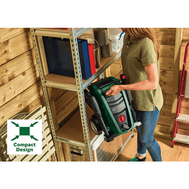 Місце для зберігання приладдя на інструменті полегшує пересування між різними ділянками, які треба очищувати. Шланг високого тиску, миючий пістолет і насадку для мийного засобу можна зберігати на машині, ідеально пристосованій для зберігання в невеликих будинках.
