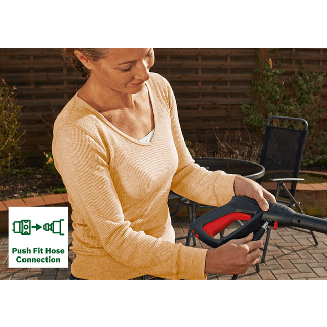 Мийка високого тиску UniversalAquatak 135 дозволяє виконувати очищення швидко, гнучко і без зусиль. Потрійна насадка Trio Nozzle справляється з різноманітними завданнями: від очищення садових меблів до промивання водовідвідних каналів. Залежно від потреб конкретного завдання налаштовують віялоподібний, обертовий або компактний струмінь. Економте свій час, миючи автомобілі 450 мл насадкою високого тиску з мийним засобом. Розсувне руків'я і колеса збільшеного розміру покращують мобільність і полегшують зберігання. Тихіший двигун насоса підвищує комфорт користувача під час очищення. З'єднання з фіксацією при натисненні та наявність місця зберігання мийного пістолета суттєво полегшують чищення.